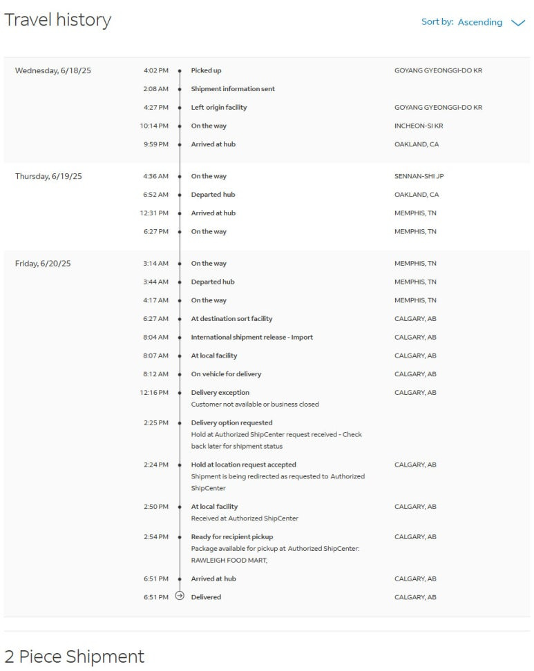 6월 18일 발송한 택배가 캐나다에서 6월 20일 배달완료된 것을 확인할 수 있습니다.